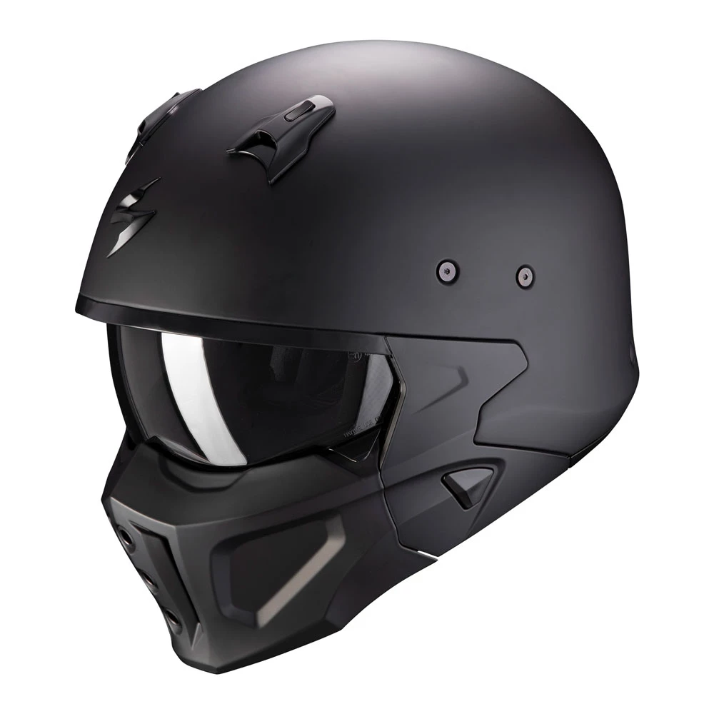 Nuovo casco Scorpion Covert X, Scocca in composito avanzato in policarbonato: design silenzioso e aerodinamico per il comfort testato nella galleria del vento. Mentoniera foderata in EPS per una protezione aggiuntiva.